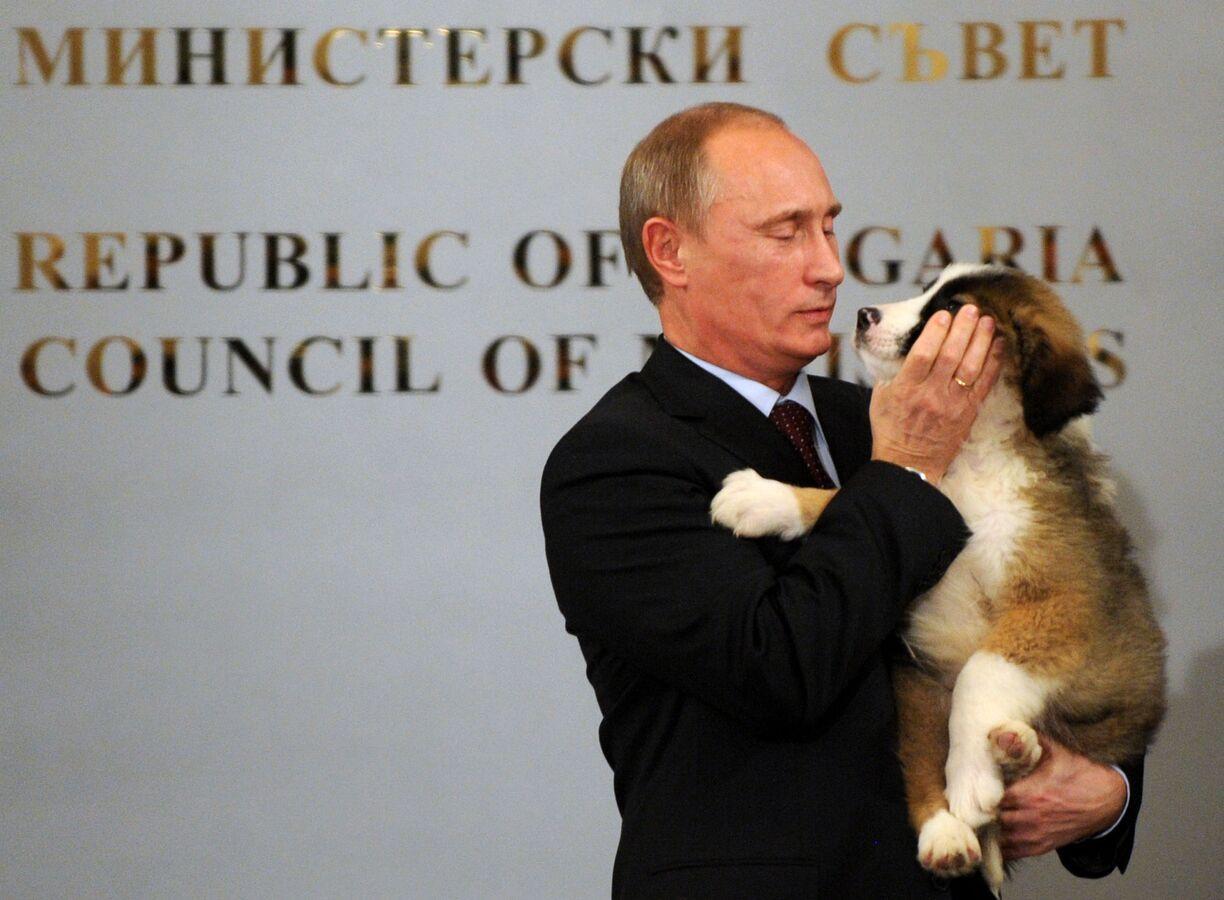 بينما المقطع الثاني يظهر بوتين وهو يحمل الجرو “ألاباي” ويداعبه ضاحكا.