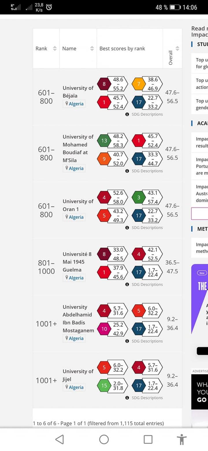 وضم التصنيف 5 جامعات جزائرية احتلت فيها جامعة محمد بوضياف بالمسيلة المرتبة الأولى وطنيا و801-1000 عالميا لتليها جامعة قالمة في المرتبة الثانية ثم جامعة بجاية، فجيجل وفي المرتبة الخامسة جامعة وهران.
