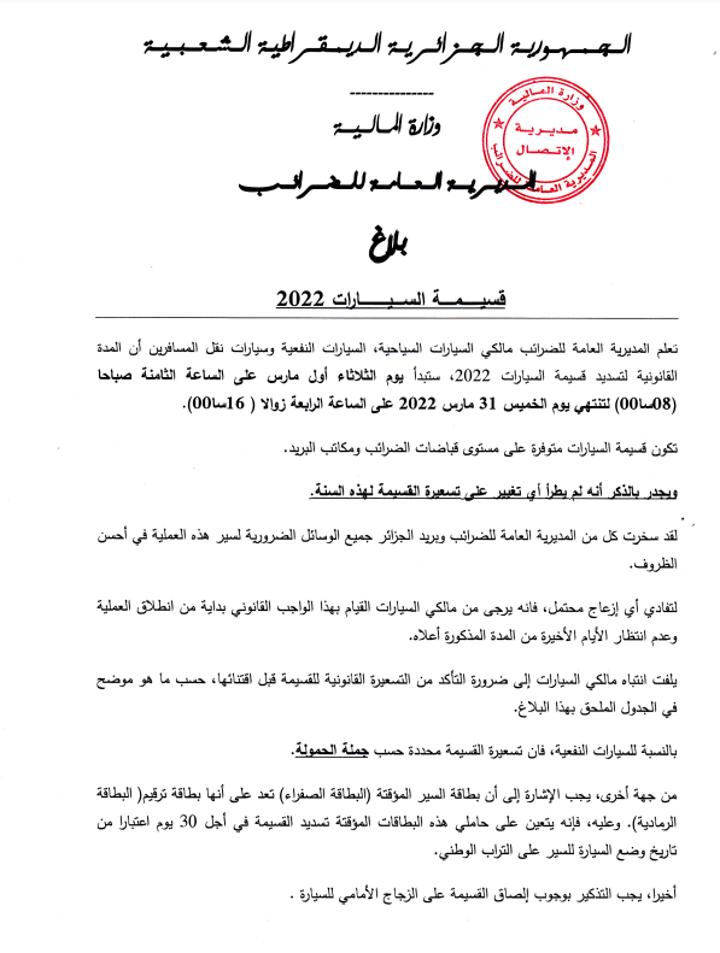 أفريقيا برس – الجزائر. أعلنت المديرية العامة للضرائب أن فترة بيع قسيمة السيارات لمالكي السيارات السياحية، النفعية وسيارات نقل المسافرين تبدأ الثلائاء 1 مارس وتنتهي الخميس 31 مارس 2022.
