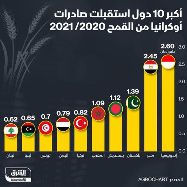وبالنسبة للدول العربية الأخرى تعتمد مصر بصورة كبيرة على القمح اوكرانيا وتعد مصر ثاني أكبر دولة استوردت القمح من أوكرانيا في العام المالي 2021/2020 والأولى عربياً تليها المغرب، ومعهما اليمن، تونس، ليبيا ولبنان.