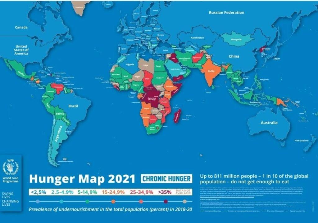 و جاء في تقرير المنظمة أيضا أن أكثر من 811 مليون شخص يعانون من المجاعة أغلبهم في القارة الأفريقية، فأكثر من ثُلث سكان الصومال، الكونغو، إفريقيا الوسطى وليبيريا يعانون المجاعة، حيث تتصدرت هذه الدول أسوء المؤشرات في القارة والعالم بنسبة تجاوزت 35% من السكان.