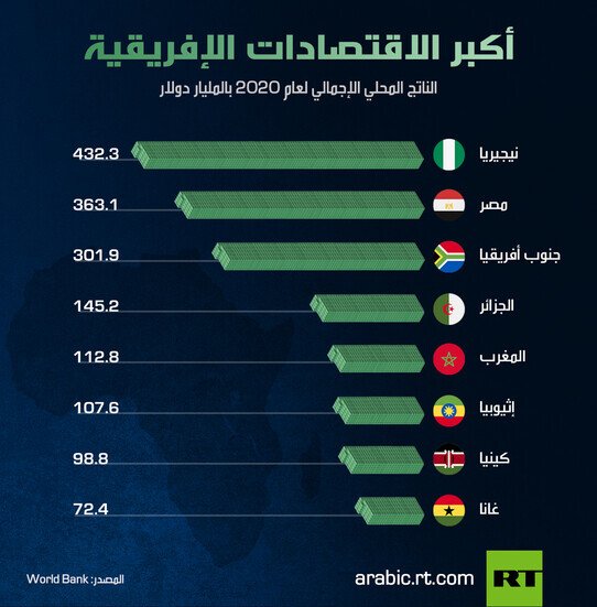 واللافت في التقرير أن تصنيف أكبر 5 اقتصادات في إفريقيا ضم 3 دول عربية، فإلى جانب الجزائر، جاءت مصر في المرتبة الثانية باقتصاد بلغ في 2020 أكثر من 432.3 مليار دولار. يليها في المرتبة الخامسة المغرب، حيث بلغ حجم ناتجه المحلي الإجمالي 112.8 مليار دولار.
