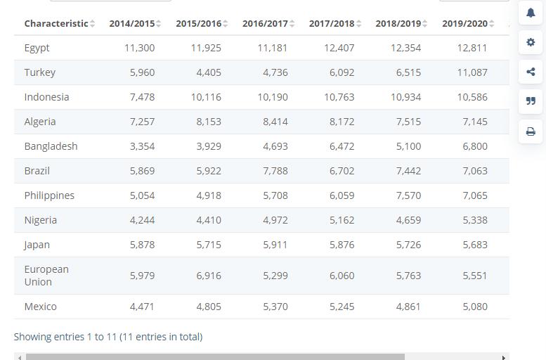 وتتصدر جمهورية مصر قائمة أكبر الدول المستوردة للقمح، تليها أندونيسا ثم تركيا وبعدهم الجزائر في المرتبة الرابعة عالميا بـ 7.7 مليون طن وجاء الترتيب كالتالي وفقا لموقع ستاتيستا: