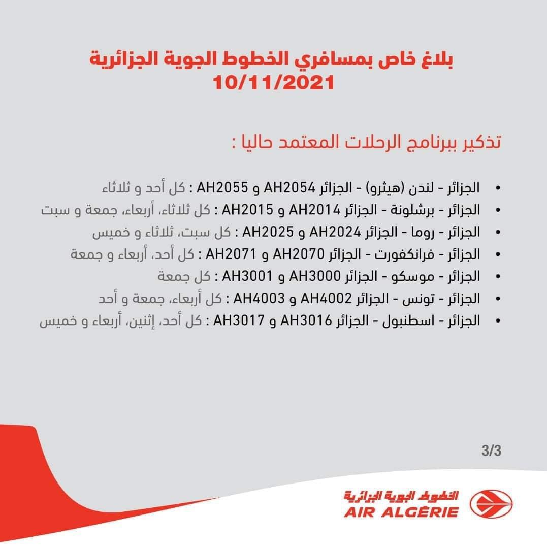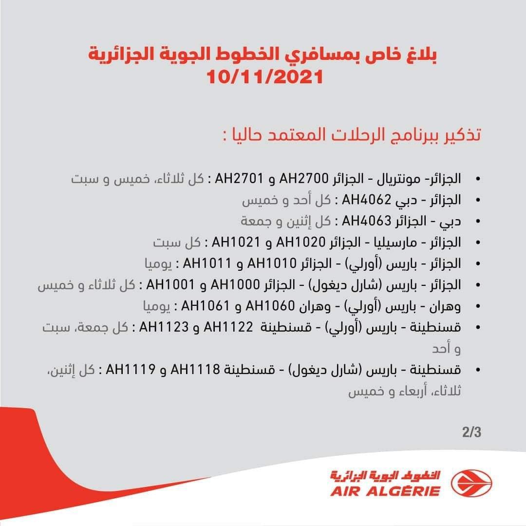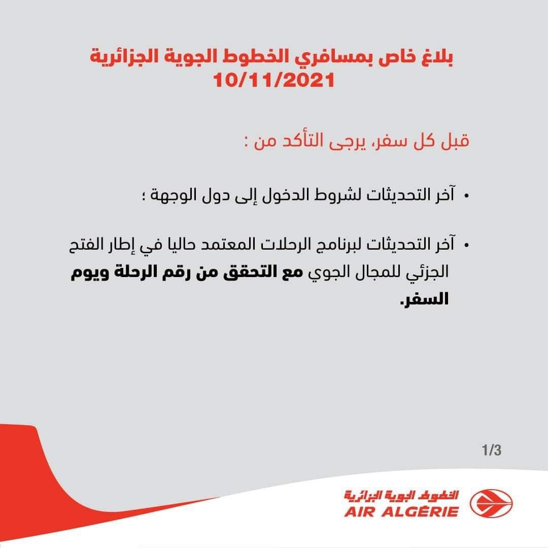 كما طالبت بضرورة التأكد من آخر التحديثات لبرنامج الرحلات المعتمد حاليا في إطار الفتح الجزائي للمجال الجوي مع التحقق من رقم الرحلة يوم السفر.