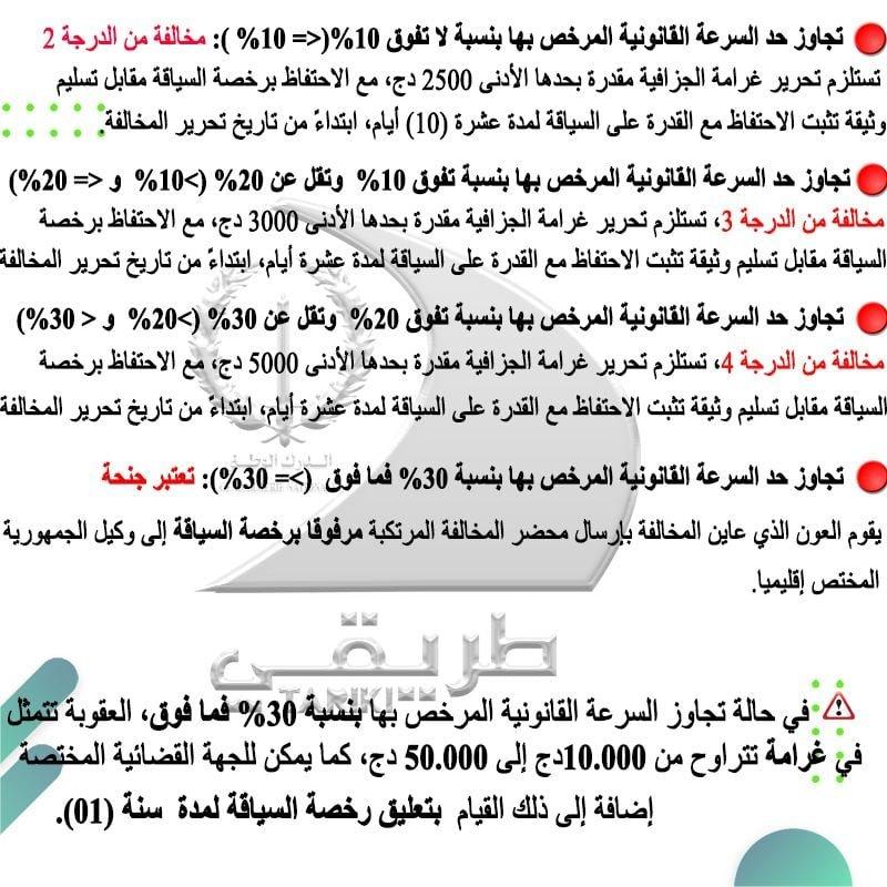 ووضعت مصالح الدرك الوطني في منشور لها على صفحتها الرسمية عبر فيسبوك، أربع نقاط ضمنتها العقوبات المترتبة عن مخالفة الأحكام المتعلقة بتجاوز حد السرعة القانونية المرخص بها، لمركبات نقل الأشخاص والبضائع التي يتجاوز وزنها الإجمالي المرخص به مع الحمولة، بما في ذلك المقطورات، 3,5 طن.