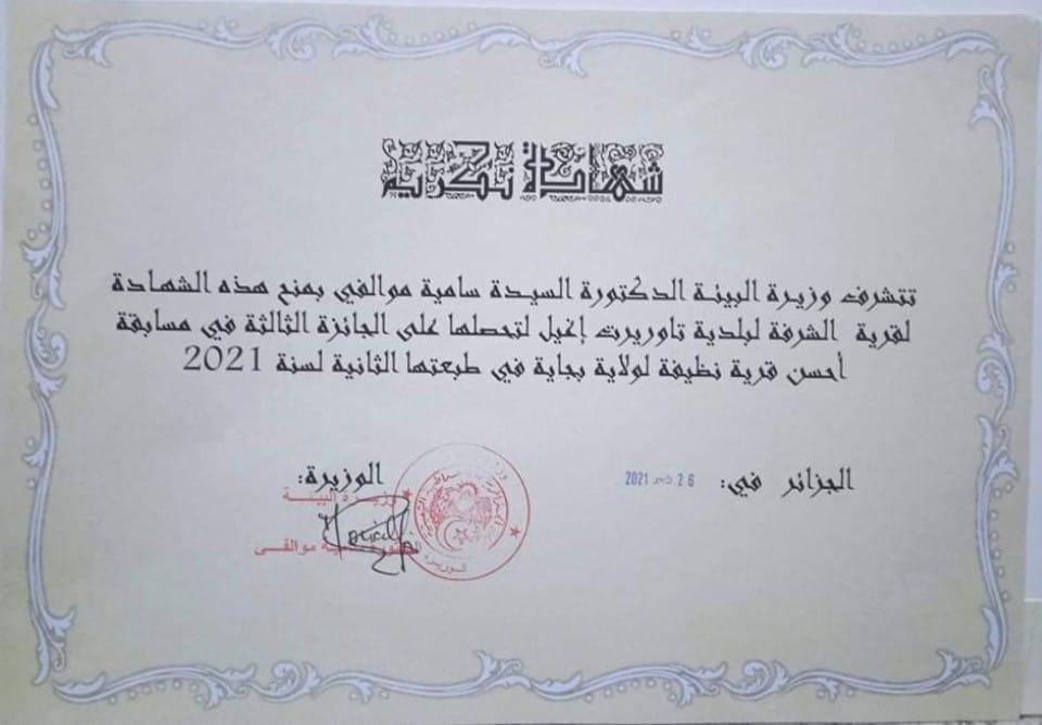احتلّت قرية الشرفة المرتبة الثّالثة في مسابقة أنظف قرية بولاية بجاية سنة 2021.