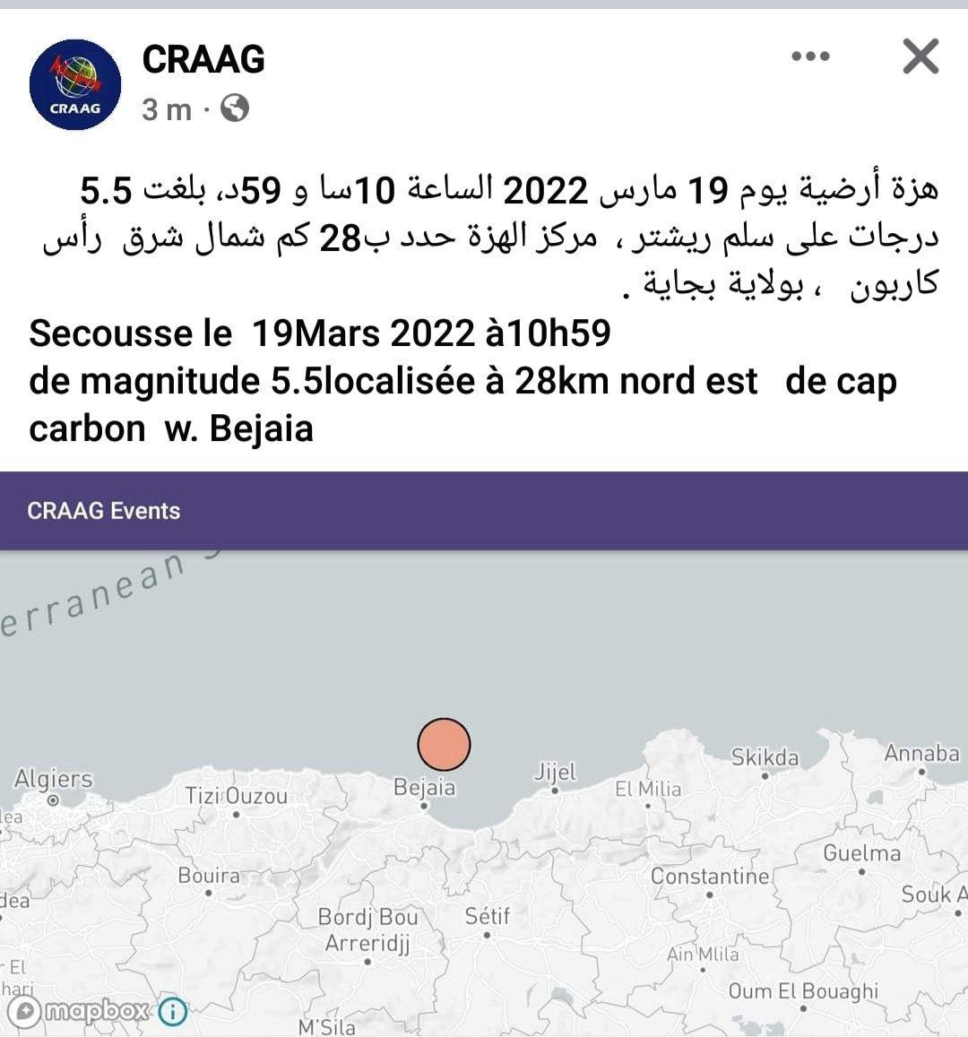 تابعا #للهزة_الأرضية المسجلة على مستوى ولاية #بجاية 5.5 على سلم ريشتر، 28 كلم شمال شرق كاب كاربون تم تسجيل