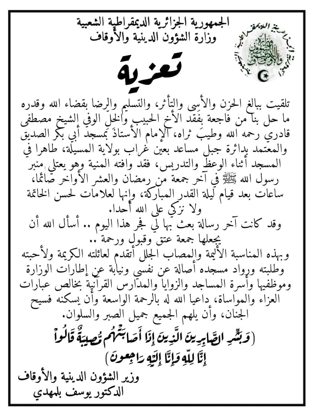 أفريقيا برس – الجزائر. ترجل الشيخ مصطفى قادري، معتمد الشؤون الدينية والأوقاف بدائرة جبل امساعد جنوب المسيلة، الجمعة، إلى جوار ربه من على منبر المسجد، أمام أنظار جموع المصلين الذين شهدوا له اللحظات الأخيرة من حياته داخل بيت من بيوت الله.