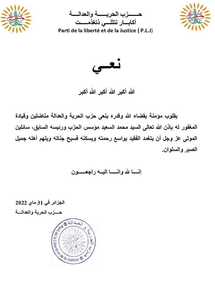 قضى المولى تبارك وتعالى أن نُفجع معكم بمصابنا الأليم في فقد المرحوم محند أوسعيد، الذي يلتحق إلى جوار ربّ العزّة بعد أن كابد بصبر وإيمان الابتلاء بالمرض، وبرحيله نُودع ببالغ التأثر والأسى إعلاميًا كبيرًا مقتدرًا من جيل الرواد الأكفاء، خدم بلده بإخلاص وتفان من خلال المهام والمسؤوليات التي تولاها سفيرًا ووزيرًا، ومساهماته في النشاط السياسي ..