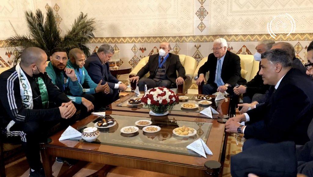 وكان في استقبال محاربي الصحراء أبطال العرب، بالقاعة الشرفية لمطار هواري بومدين، الوزير الأول أيمن بن عبد الرحمان و أعضاء من الطاقم الحكومي إلى جانب رئيس الاتحاد الجزائري لكرة القدم شرف الدين عمارة.
