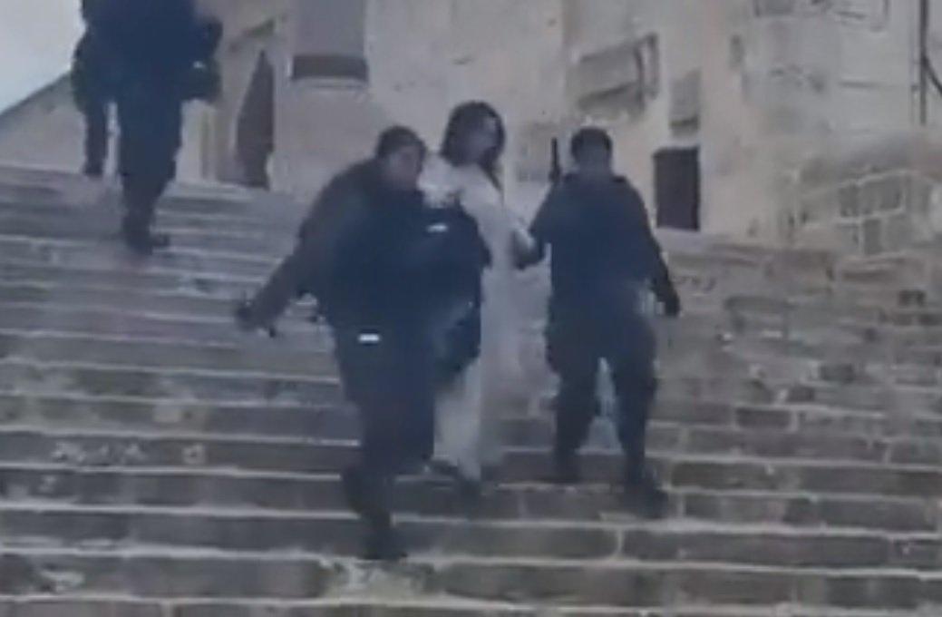 أظهر فيديو تم تداوله على مواقع التواصل، عناصر من الشرطة ال”إسرائيل”ية وهم يقتادون ة الجزائرية إلى خارج الأقصى حيث نزعوا حجابها.
