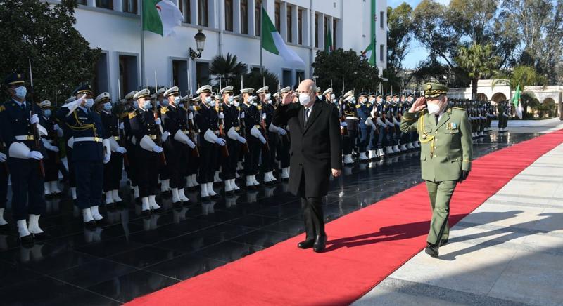 وبعد الاستماع للنشيد الوطني، وتقديم التشريفات العسكرية له، من طرف تشكيلات من مختلف قوات الجيش الوطني الشعبي، حيا رئيس الجمهورية مستقبليه، السادة قائد الحرس الجمهوري والأمين العام لوزارة الدفاع الوطني وقادة القوات والدرك الوطني وقائد الناحية العسكرية الأولى والمراقب العام للجيش ورؤساء الدوائر بوزارة الدفاع الوطني وأركان الجيش الوطني الشعبي.