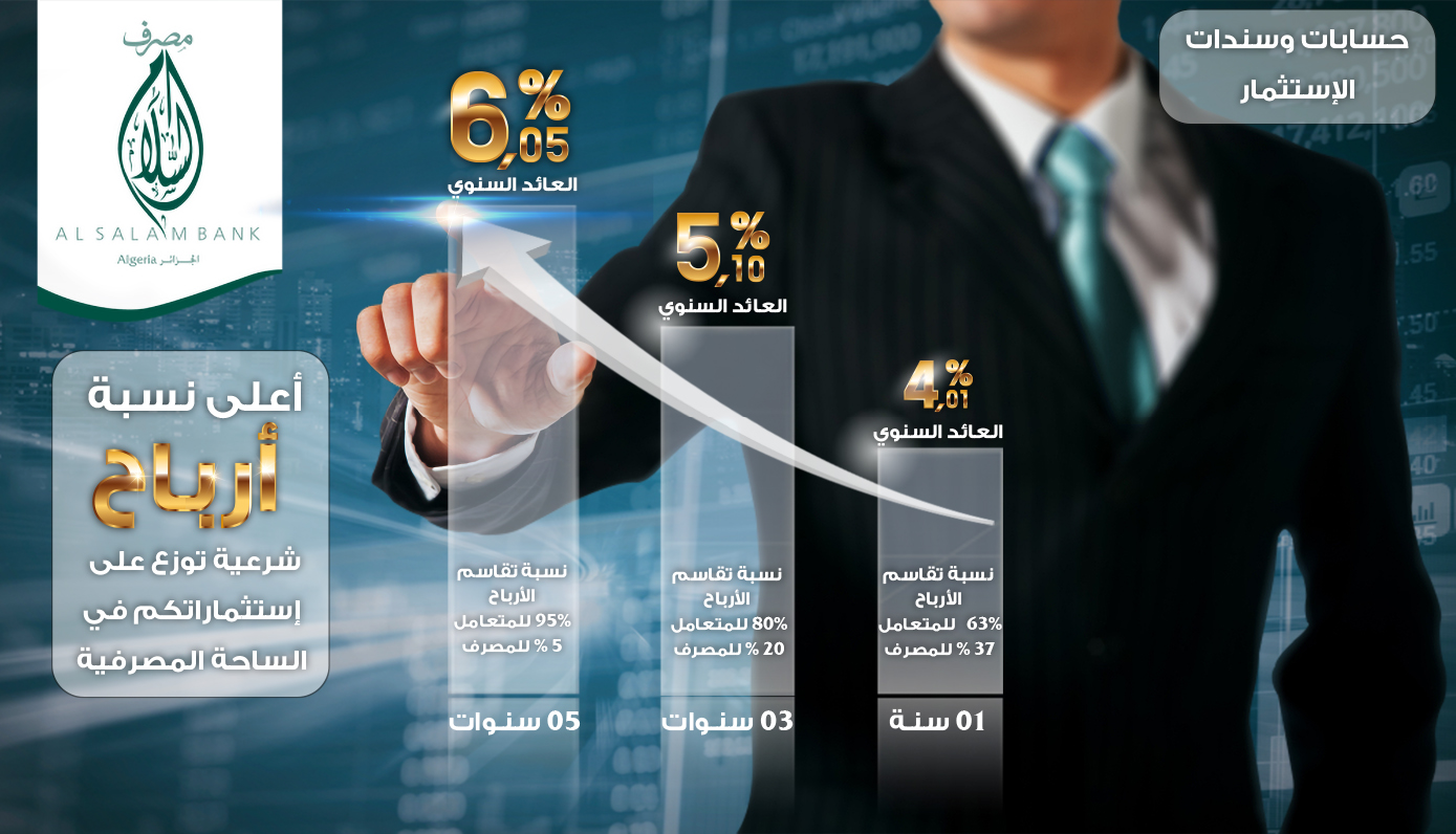 وزع مصرف السلام الجزائر على متعامليه أصحاب الإيداعات الإستثمارية للثلاثي الرابع على التوالي من سنة 2019 أعلى نسبة أرباح سنوية يتم توزيعها في السوق حيث بلغت 6.44% سنويا من مبلغ الإيداع بمبلغ إجمالي بلغ 1.2 مليار دينار(120 مليار سنتيم).