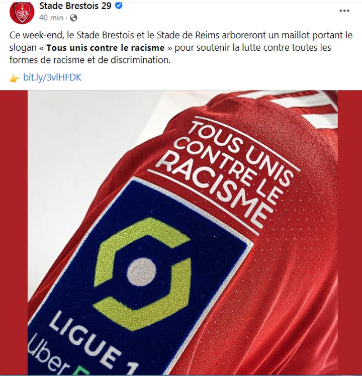 أفريقيا برس – الجزائر. أعلن نادي بريست الفرنسي، عن ارتداء لاعبيه ولاعبي نادي ريمس، بمناسبة الجولة 26 من الدوري الفرنسي، قمصان عليها شعار ” كلنا متحدون ضد العنصرية”..