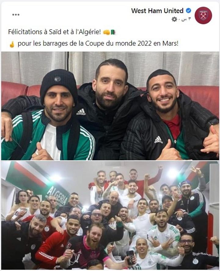 أما نادي واست هام فقد كتب على حسابه الرسمي: “هنيئا السعيد وهنيئا للجزائر التأهل إلى مباراة السد من تصفيات المونديال”.