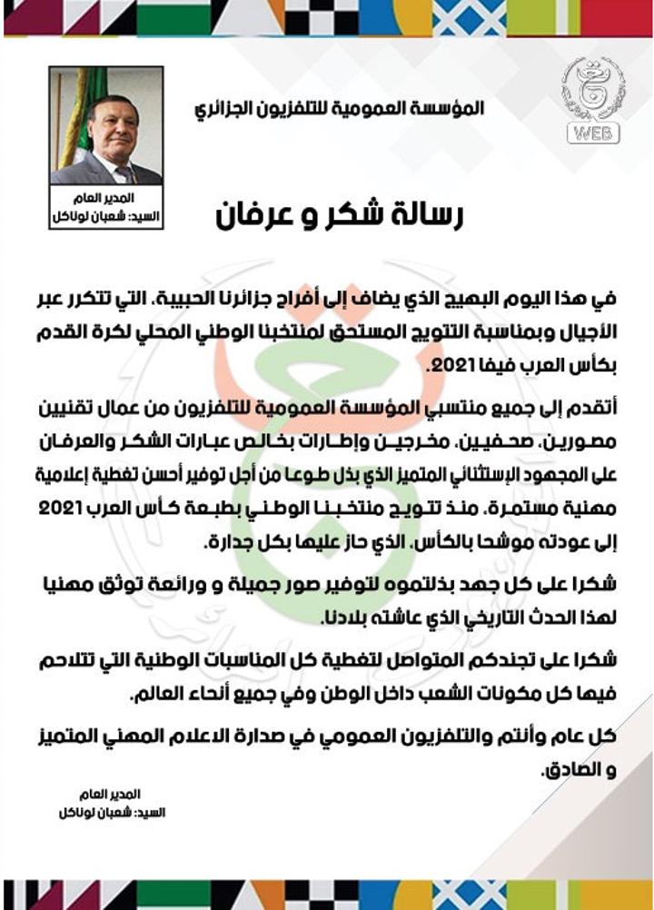 وأضاف: “أتقدم إلى جميع منتسبي المؤسسة العمومية للتلفزيون من عمال تقنيين مصـوريـن، صحـفيـين، مخـرجيــن وإطــارات بخـالـص عبـارات الشكـر والعرفان على المجهود الاستثنائي المتميز الذي بذل طـوعا من أجل توفير أحسن تغطية إعلامية مهنية مستمـرة، منـذ تتـويـج منتخـبـنـا الوطـنـي بطبـعة كـأس العرب 2021 إلى عودته موشحا بالكأس، الذي حاز عليها بكل جدارة”.