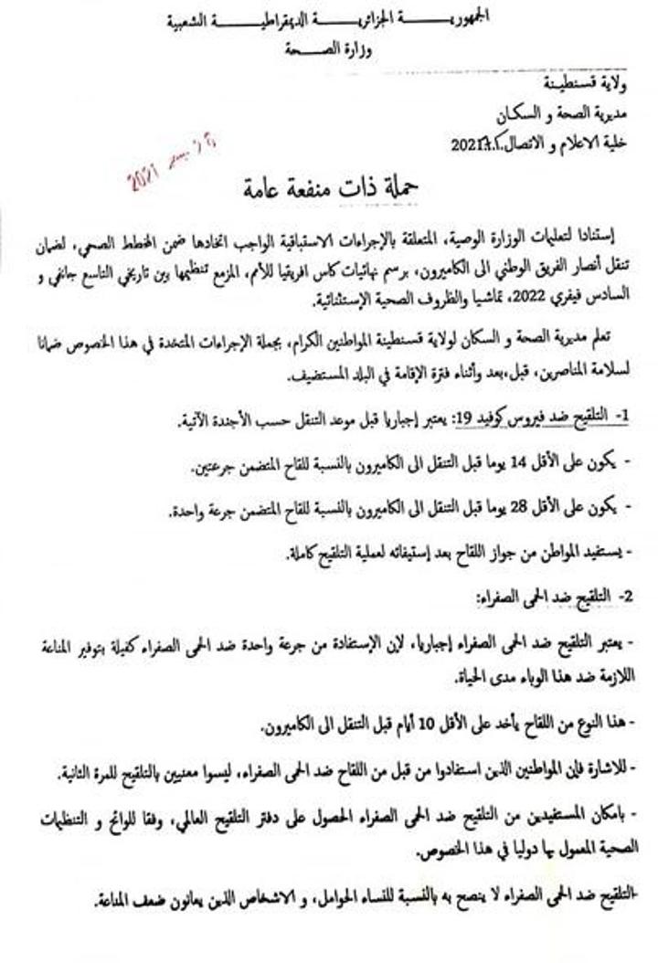 أفريقيا برس – الجزائر. أعلمت مديرية الصحة والسكان لولاية قسنطينة، الأنصار الراغبين في التنقل إلى الكامرون لمساندة “الخضر” في كأس أمم إفريقيا، بالإجراءات الصحية الإجبارية، قبل السفر، وأثناء الإقامة في الكامرون.
