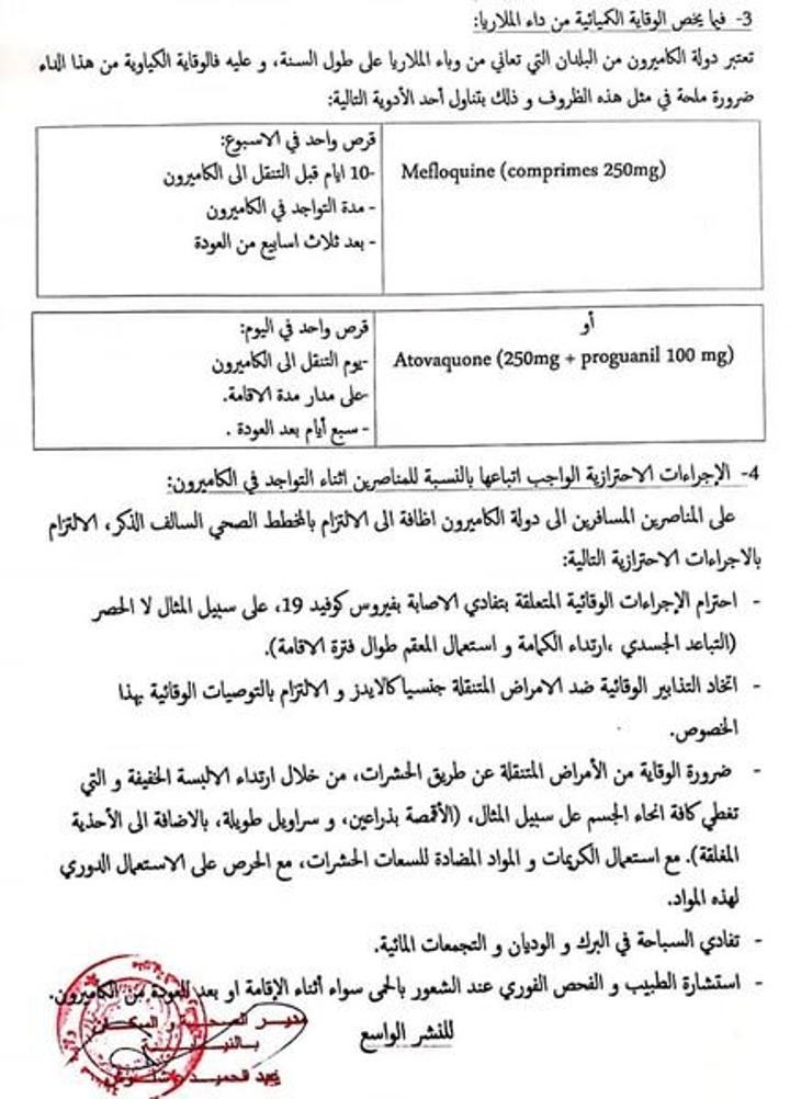 وبما أن الكامرون تعاني من داء الملاريا على طول السنة، أكدت مديرية الصحة والسكان أن الوقاية من هذا الداء، بأخذ قرص من دواء “ميفلوكين”، 10 أيام قبل التنقل، وأثناء الإقامة، وثلاثة أسابيع بعد العودة، أو تناول قرص من دواء أتوفاكون – بروغوانيل، ويكون ذلك بأخذ قرص واحد يوم التنقل وأثناء الإقامة وسبعة أيام بعد العودة.