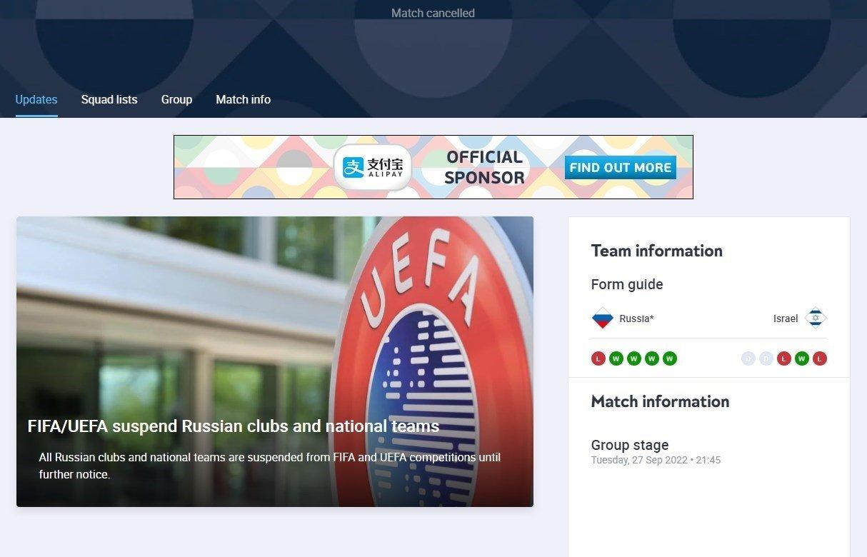 فجميع المباريات التي كانت ستتواجه فيها روسيا مع منتخبات أخرى قد ألغيت بعد قرار الاتحاد الأوروبي لكرة القدم تعليق مشاركة روسيا في جميع المنافسات الرياضية التي ينظّمها.
