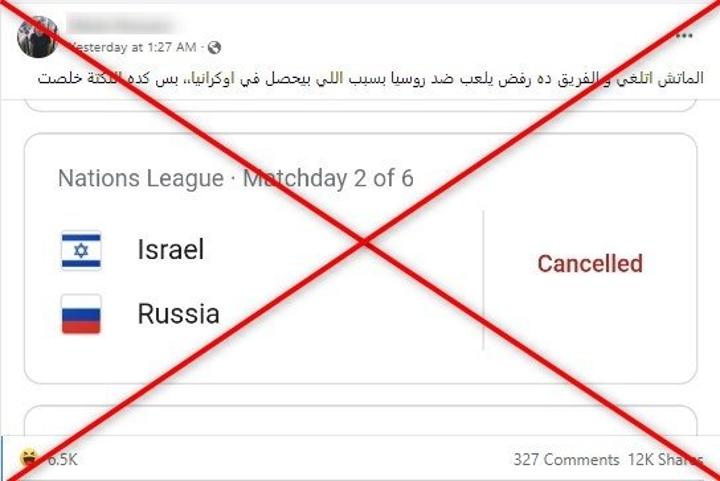 جاء في نصّ المنشورات أنّ “إسرائيل” رفضت اللّعب ضدّ روسيا في مسابقة دوري الأمم الأوروبية في كرة القدم بسبب غزوها لأوكرانيا. وضمّت المنشورات صورة ملتقطة من الشاشة لبرنامج المباريات كتب عليها “ملغاة” لتبرير الخبر.
