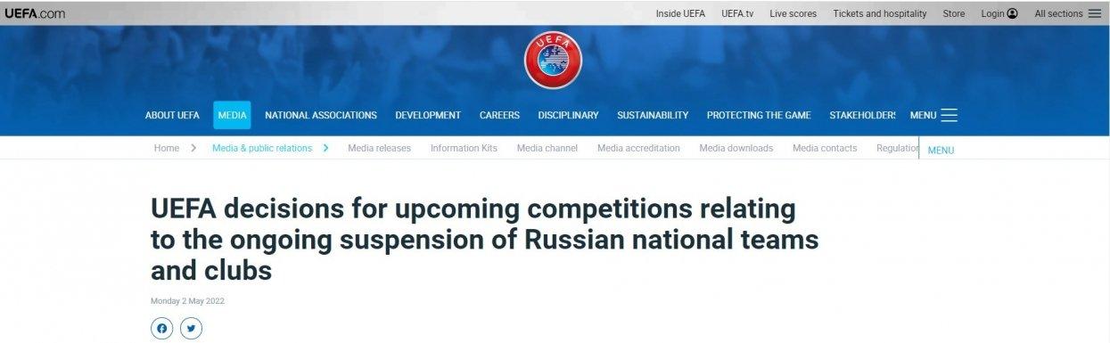 وفي الثاني من ماي 2022، قام الاتحاد الأوروبي لكرة القدم الذي يرعى مسابقة دوري الأمم الأوروبية، بتعزيز هذا الإجراء عبر تعليق مشاركة روسيا في جميع المنافسات المقبلة مع شرح تفاصيلها وتواريخها.