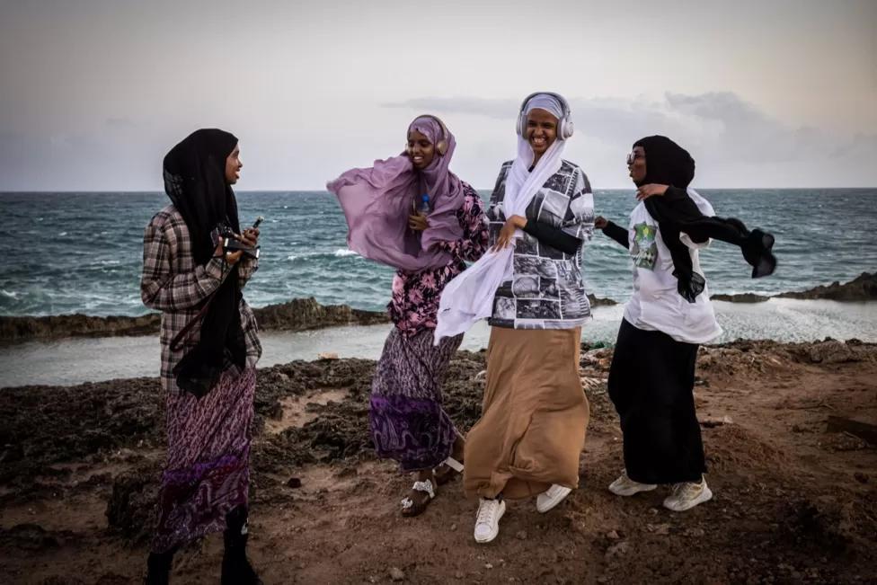 Four young women explore a beach area near the runway of Aden Adde International Airport in Mogadishu, Somalia, on Sunday.