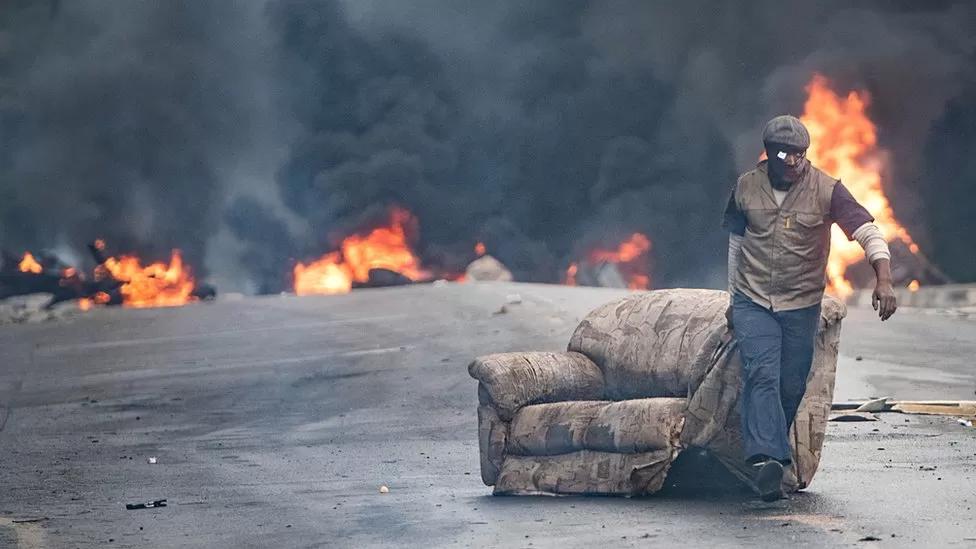 Protesting taxi drivers block the road with stones and burning tyres in Cape Town, South Africa on Monday. About 100 taxi drivers took part in the protest, accusing the City of Cape Town of impounding their vehicles in order to put buses on their route.