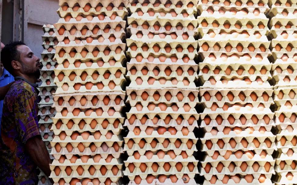 A worker carries chicken eggs at a farm in Cairo, Egypt, where egg prices have risen because of higher feed prices after Russia’s invasion of Ukraine.