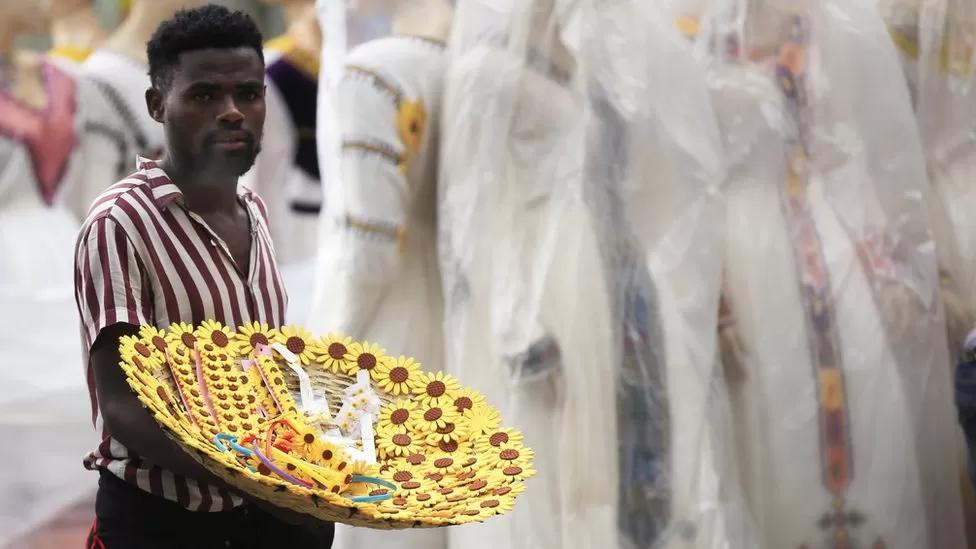 On Tuesday, a vendor in Addis Ababa displays flower motif ornaments known as “Adey Abeba” ahead of Ethiopia’s New Year…