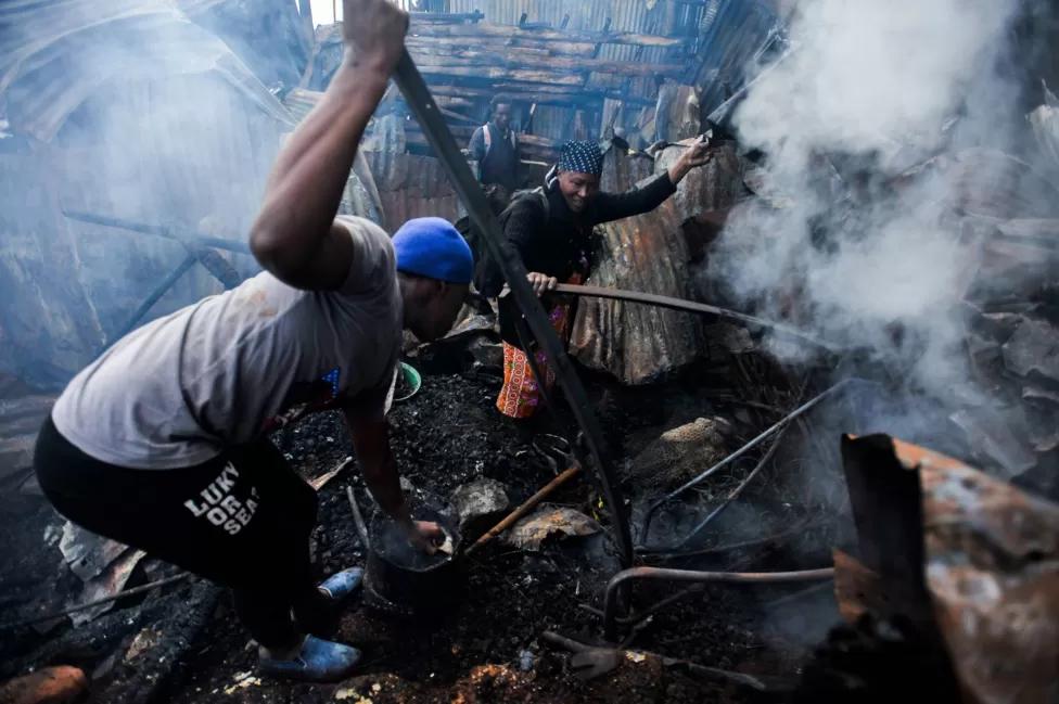 In Nairobi’s Kibagare slum on the same day, people try to save their belongings after fire broke out, destroying many houses.