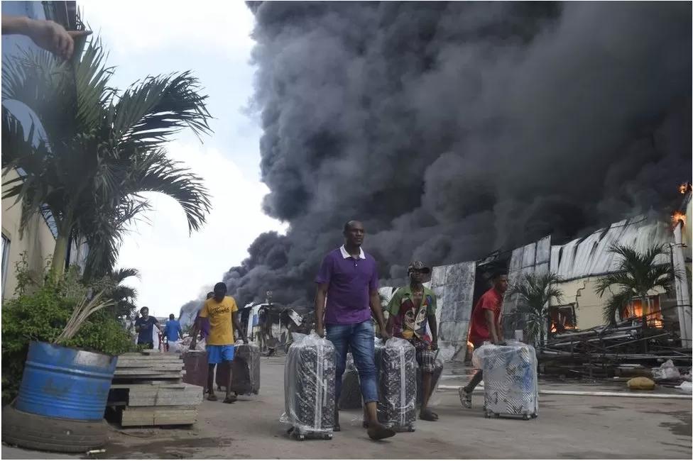 Nigerians pack their bags as they seek to escape a fire at the Yanuo factory and warehouse in Ogun State, in the south-west of the country on Monday. The Chinese Yanuo factory produces bags and suitcases.