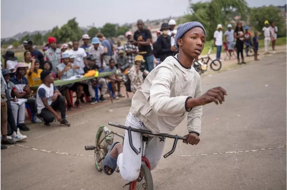 A young South African man pulls a stunt at an event run by the Soweto Street Fighters crew on Saturday, in which hundreds of young men from the township gather to compete for who puts on the best performance, including the best looking bike.