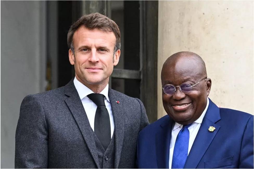 French President Emmanuel Macron welcomes his Ghanaian counterpart, Nana Akufo-Addo, to the Élysée Palace on Thursday. Days earlier, Mr Akufo-Addo was awarded an honorary doctorate degree from the University of Sorbonne in Paris for his work as president, including entrenching democratic values in Ghana.