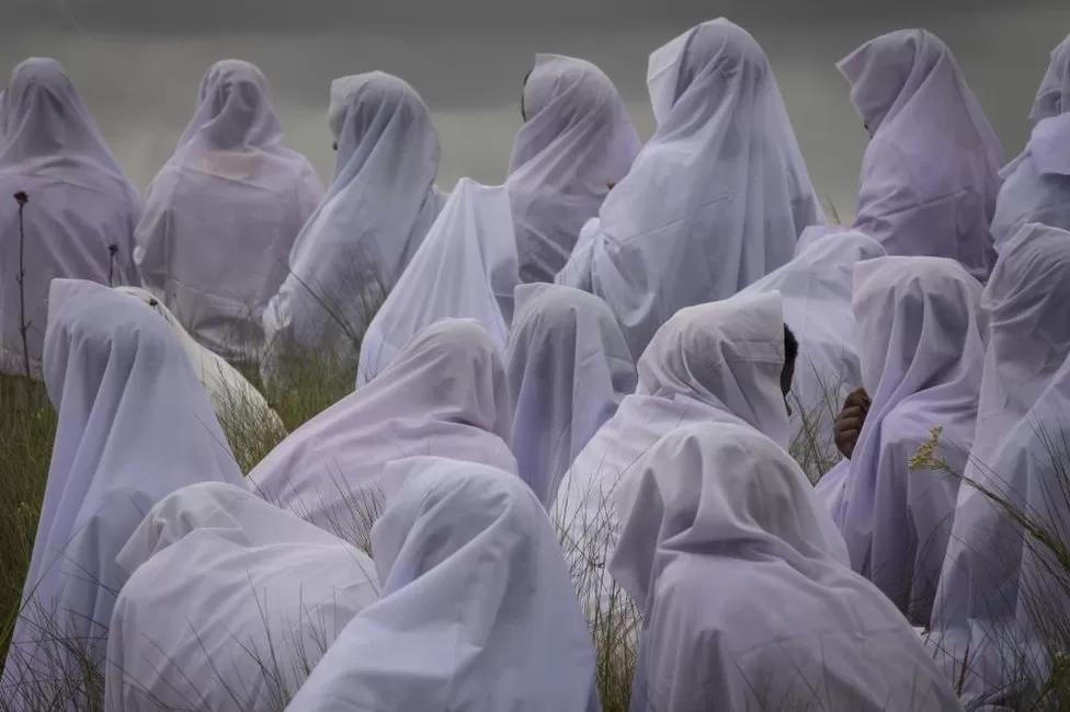 Some of the 20,000 people taking part in the annual pilgrimage of South Africa’s Shembe Church are seen walking on Saturday up to the holy mountain of Nhlangakazi near Durban…