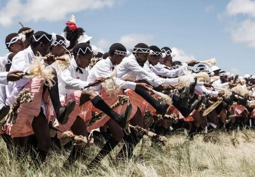 Dancers perform on the mountain near the summit on Sunday – the occasion mixes Christian rituals with traditional Zulu elements.