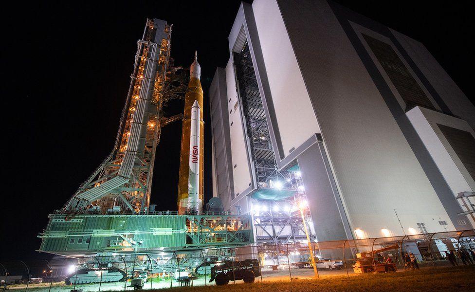 Known as the Space Launch System (SLS), the vehicle is being taken to Pad 39B at the Kennedy Space Center in Florida for a lift-off scheduled for 29 August.
