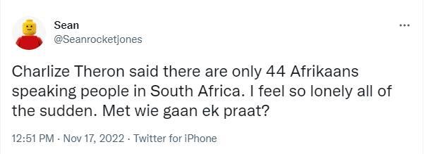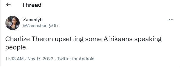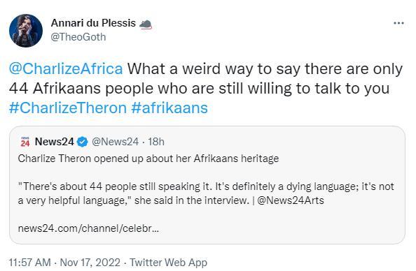 Regarding the actress’ connections with Afrikaans, her great-great-uncle, Danie Theron, is known to have been a Boer military leader and a hero in the Second Boer War against the British.