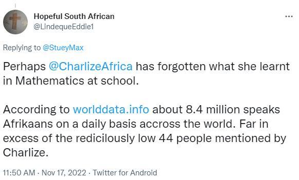 Africa-Press – Angola. The claim sparked a social media firestorm, with users pointing out in the comments, hundreds of which were written in – surprise, surprise – Afrikaans, how the actress couldn’t have been more wrong.