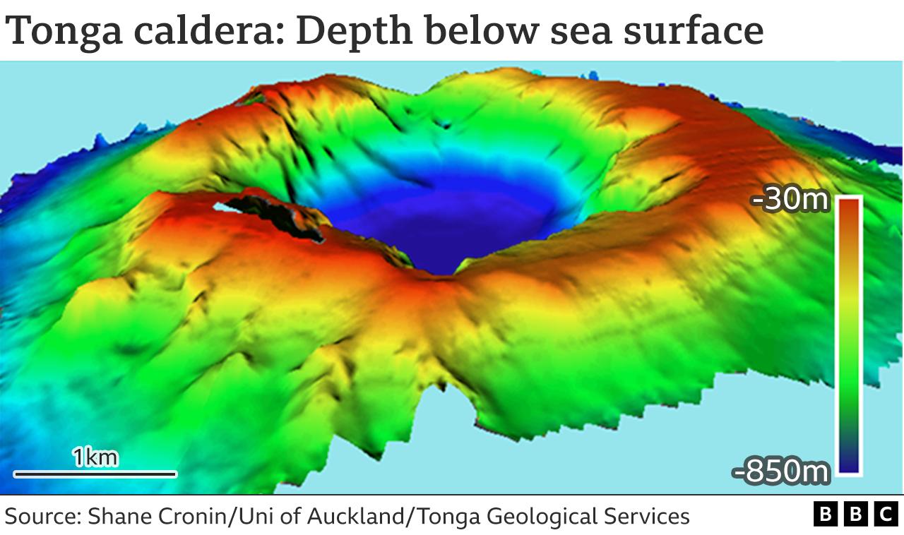 The caldera of Hunga-Tonga Hunga-Ha’apai is now 4km (2.5 miles) wide and drops to a base 850m below sea level.