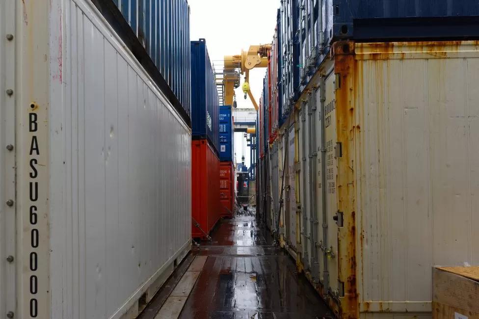 Scores of supply-laden containers are loaded onto the vessel before departure