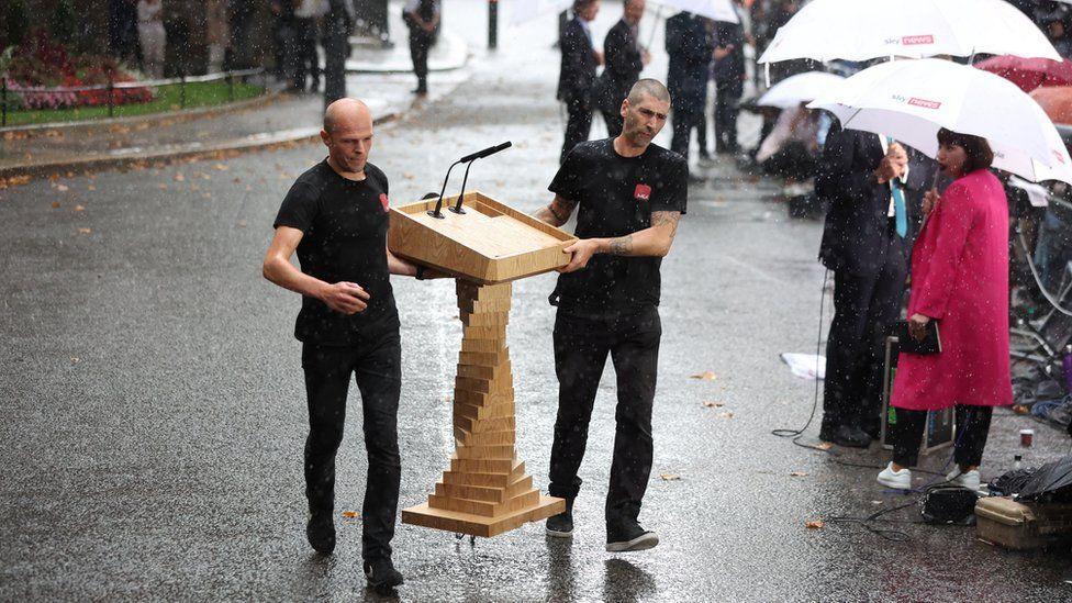 As rain hit Downing Street, the lectern from which Ms Truss would make her speech was swiftly moved inside only to be brought back out just minutes later as the downpour eased
