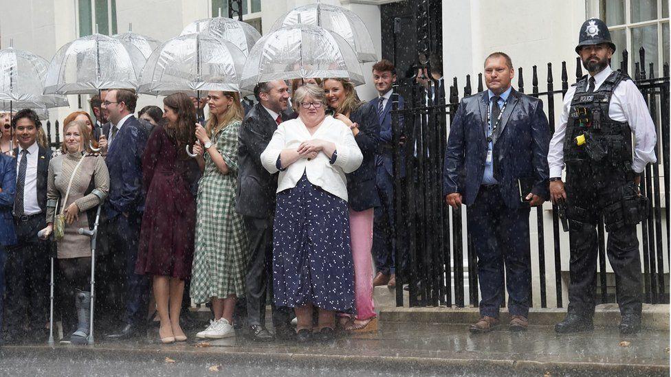MPs, Downing Street staff and supporters were caught in the heavy rain as they waited for Ms Truss to arrive at Number 10