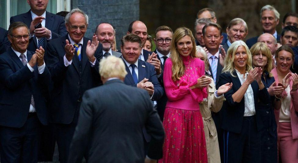 Mr Johnson’s wife Carrie, pictured in pink, and his sister Rachel were among supporters who gathered to watch his parting words, which brought to an end a tumultuous premiership of less than three years