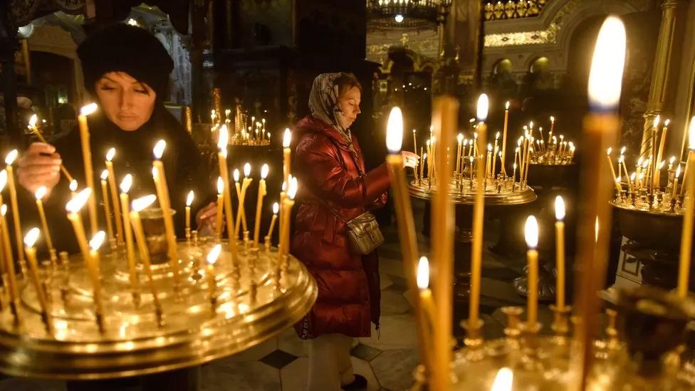 Inside the Kremlin, President Vladimir Putin cut a solitary figure as he attended a service at the Annunciation Cathedral. He had sought to declare a brief ceasefire in Ukraine to mark the occasion, but was rejected by Kyiv.