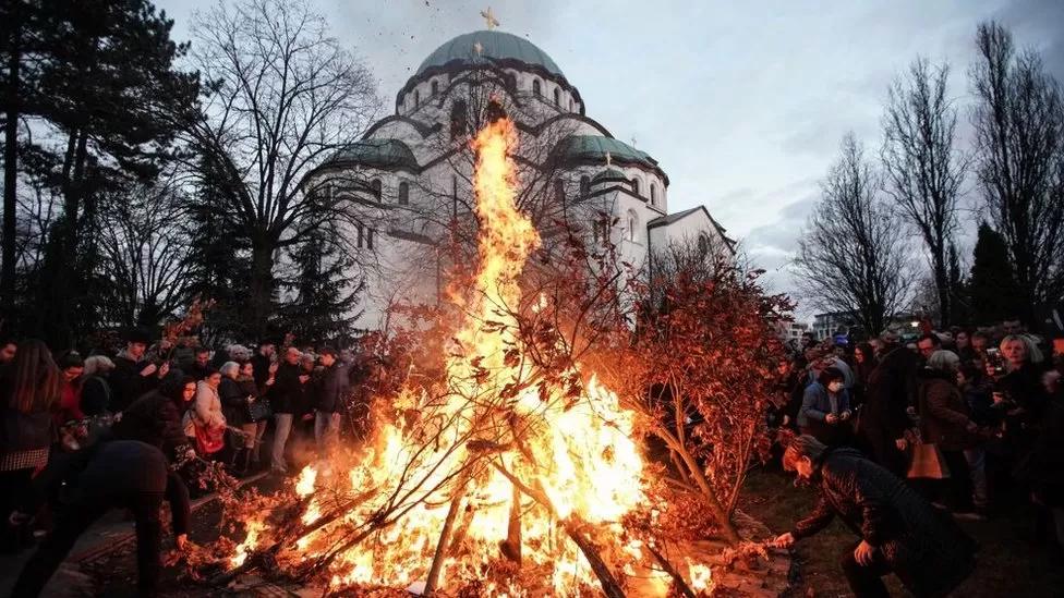 In Serbia, people attended the annual bonfire of dried oak branches – the badnjak – the at the Church of Saint Sava in Belgrade. The fire symbolises that built by the shepherds to warm the baby Jesus in his manger.