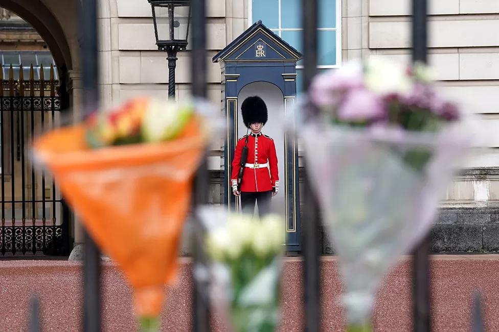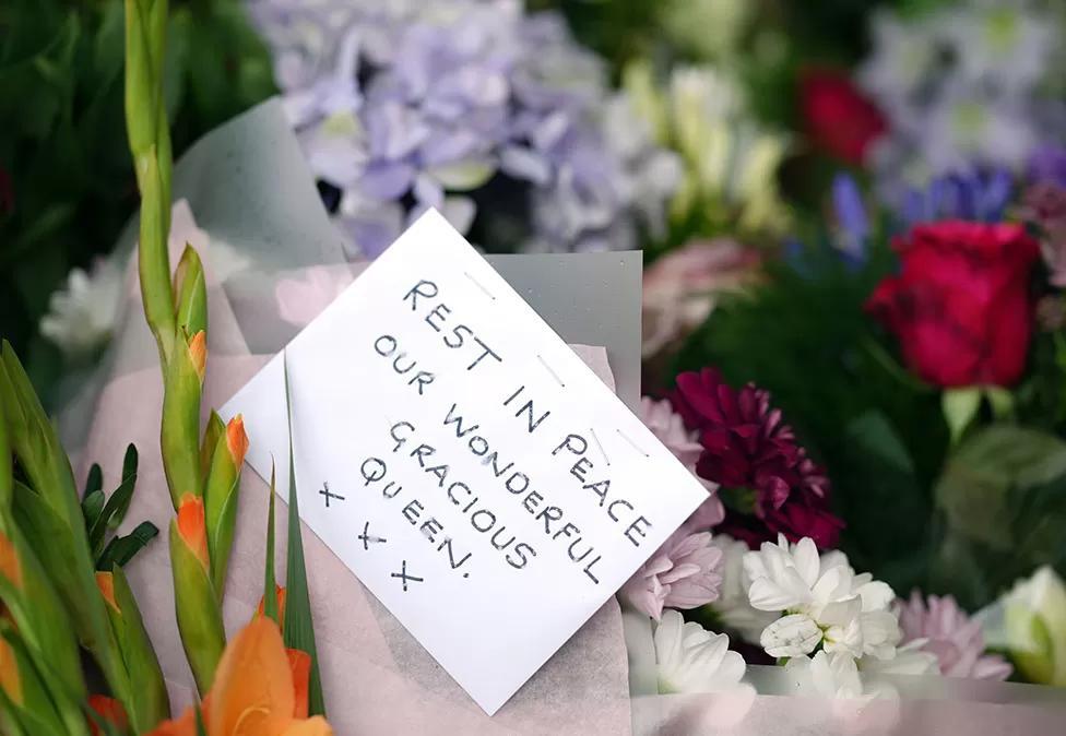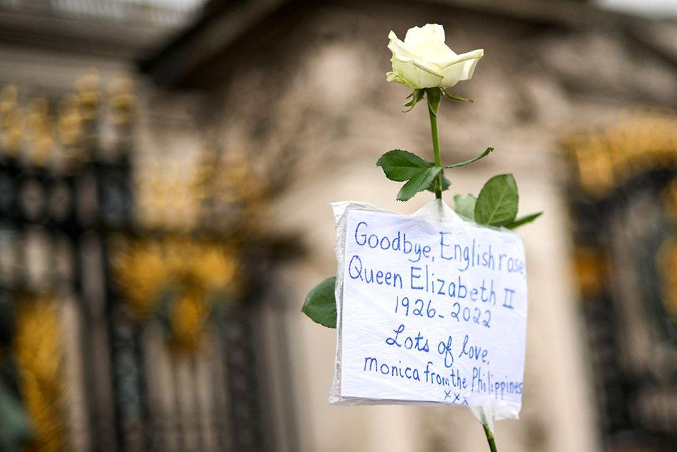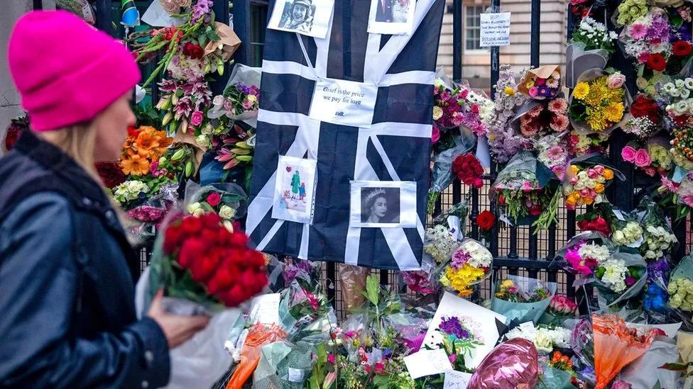 Messages, flowers and flags were left outside Buckingham Palace, the London residence of the late Queen.