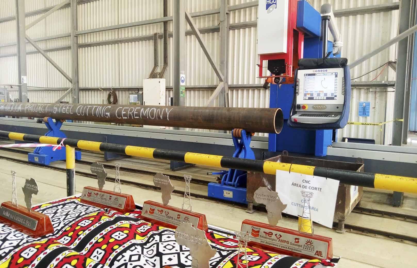 The steel cutting ceremony starts the manufacturing of the N’dola Sul wellhead platform and results in a gradual production of oil and gas, whose oil platform will channel it to the Malongo terminal in Cabinda and to the Angola LNG factory in Soyo ( Zaire).