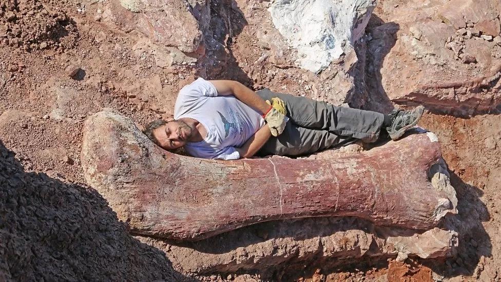 A photo of one of the researchers lying alongside a femur, or thigh bone, to illustrate the animal’s great size was printed in newspapers around the world.