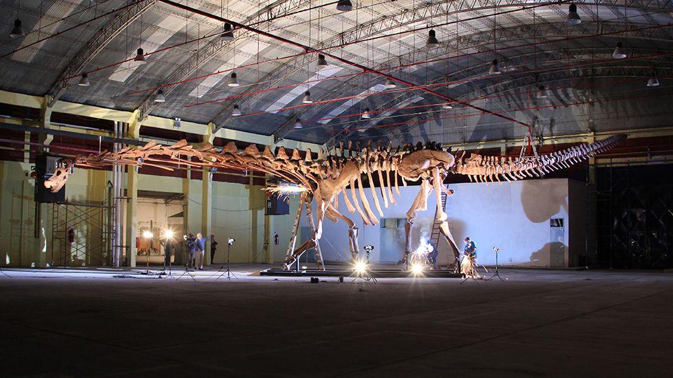 The replica skeleton is being loaned from Argentina’s Museo Paleontológico Egidio Feruglio (MEF), whose staff excavated the animal’s giant bones in 2014.