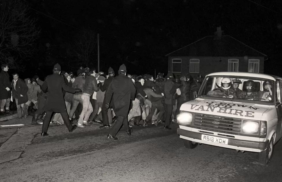 This photo captures the moment working miners broke through the picket line at Celynen South Colliery in Newbridge during the miners’ strike